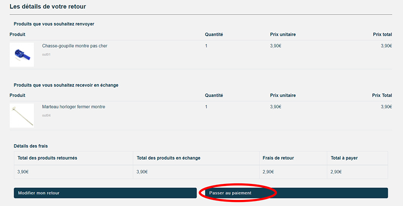 Un récapitulatif s'affiche avec le(s) produit(s) à retourner et le(s) produit(s) souhaité(s) en échange. Cliquez ensuite sur "Passer au paiement" afin de procéder au règlement des frais d'échange.