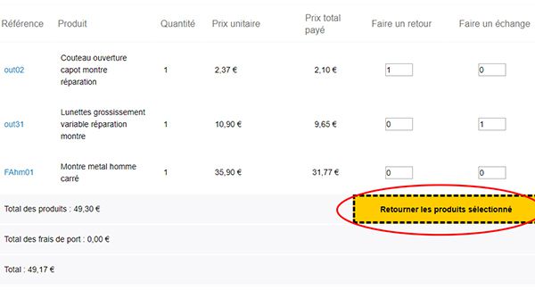 Cochez les produits que vous souhaitez retourner pour un remboursement, ainsi que la quantité que vous souhaitez renvoyer. Si vous souhaitez échanger un produit de votre commande par un autre au sein de notre boutique, merci suivre Faire un échange. Après avoir sélectionné les produits que vous souhaitez retourner, cliquez sur "Renvoyer un produit".