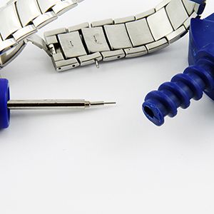 Dans cette étape du guide pour raccourcir un bracelet en acier, vous allez extraire une goupille d'un maillon de la montre. Cette partie nécéssite un chasse-goupille à poignée.