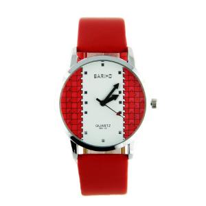 Un cadran original de montre de couleur rouge et blanc présente 3 aiguilles. Ses aiguilles de cette horlogère BARIHO pour les femmes sont de couleur noires. Cette trotteuse noire et rouge en son centre aide à déterminer l'heure exacte. Cette horlogère BARIHO femme présente des côtés droits et gauches du cadran avec un motif de puzzle de couleur rouge. La ligne centrale du cadran est blanc et présente les repères.