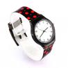 Le bracelet est en plastique noir à pois rouges est large de 1,6 cm et long de 23 cm. Il possède 10 trous pour qu'il tienne de façon du mieux que l'on puisse. Cette horlogère présente son fermoir à boucle ardillon noir semi-opaque, composée de plastique. Le bracelet donne toute l'originalité de la montre. Grâce à ses pois rouges sur le bracelet noir, le bracelet donne de la fraicheur et du pep's à la montre.