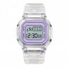 Cette montre électronique pas chère est composée d'un bracelet transparent. Une partie de son cadran est de couleur violette. Le cadran est de type LCD. Vous pouvez facilement lire l'heure dans le noir avec son éclairage. Le boîtier est de forme rectangulaire.