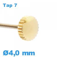 C'est une couronne de remontoir de coloris doré s'adaptant sur une stem de mouvement de même gabarit (Tap). Le calibre de pas de vis (Tap) mesure 0.70 mm. La tête de la couronne de remontoir de montre mesure 3,5 mm de diamètre. La hauteur de la tête de la couronne est de 2,2 mm. La hauteur totale de la couronne de remontoir de montre est de 2,2 mm et sert sur une stem de mouvement de pas de vis 0.70 mm (Tap). Si vous choisissez de déloger la couronne de montre abritée à l'intérieur du boîtier de montre, il est conseillé de vous munir d'un Clé d'ouverture de boîtier vissé pour réparer montre par exemple pour ouvrir la montre. Les gardes-temps de la page montre pour homme comptent une couronne remontoir. Cette couronne de remontoir de montre est résistante à l'eau. Faites attention à mesurer la longueur exacte avec le pied à coulisse digital.
