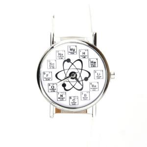 De couleur blanche, il exhibe 3 aiguilles argentées pour lire l'heure. Il est simple de lire l'heure exposée avec l'aide de 3 aiguilles argentées. Cette montre originale représente graphiquement un atome en son centre. Les éléments du tableau périodique permettent de situer efficacement les heures.